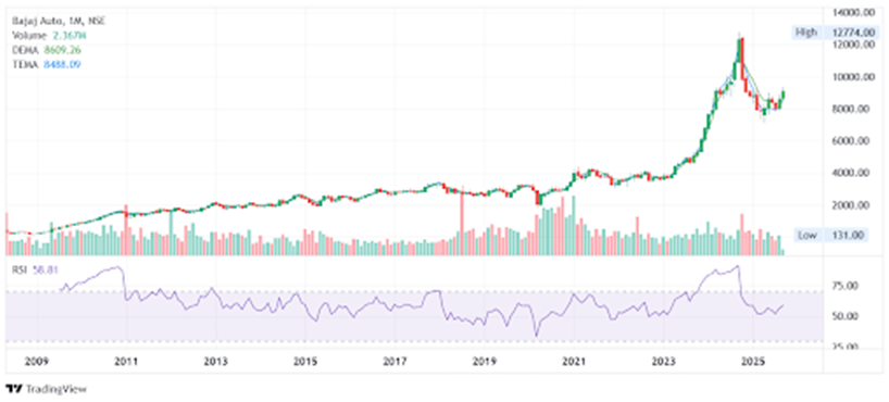 - Value Growth: Bajaj Auto shares have surged significantly, trading around ₹9,000+, with steady appreciation over the years.